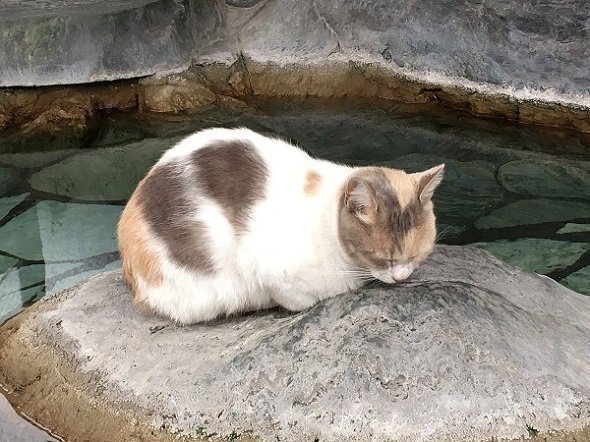 写真は、なんとものんびりとくつろぐ猫だ。通りすがりの人々の噂の的になっていたらしい。「泳いだのか、ジャンプしたのかも謎です」とコメントするのは、ツイートを投稿した水野旅館(佐賀県唐津市)の担当者だ。
