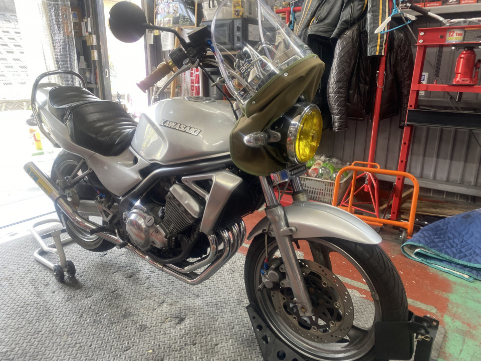 昨日はインドヤマハ fzn250のタイヤ交換や今日はカワサキのバリオスのパンク修理など色々忙しくしております。