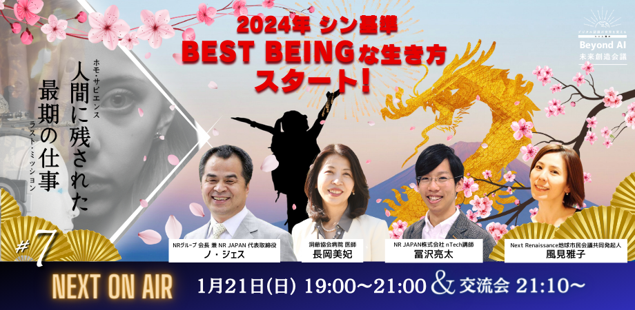 日本コンサルタントとして27年間にわたり「日本文明のアモールファティ!」を語る21世紀の悟り人・令和哲学者のノ・ジェス氏、洞爺協会病院医師の長岡美妃氏、Next Renaissance地球市民会議発足準備委員会メンバーたちのファシリテートのもと、各界で活躍されている魅力あふれるゲストを招き、視聴者参加型のトークライブを開催します。 国家や宗教、民族の境界線を溶かし、鬱や自殺、殺人、戦争といった負の側面を克服する「シン人類」へのシフトチェンジを起こす、AI時代の新しい生き方を提案するムーブメントを、地球市民として日本から共に起こしていきませんか。