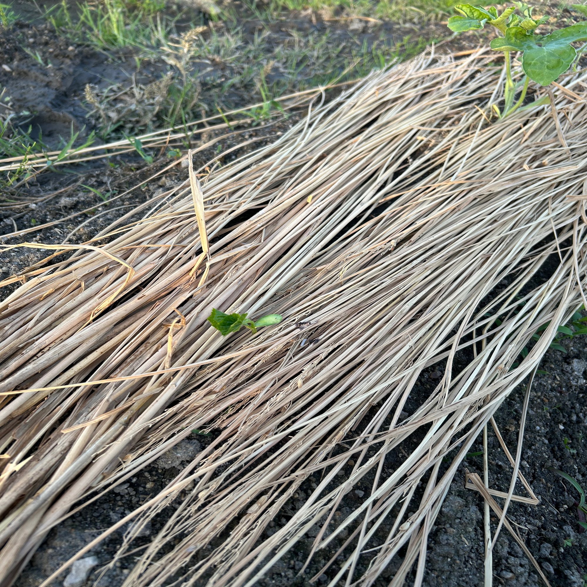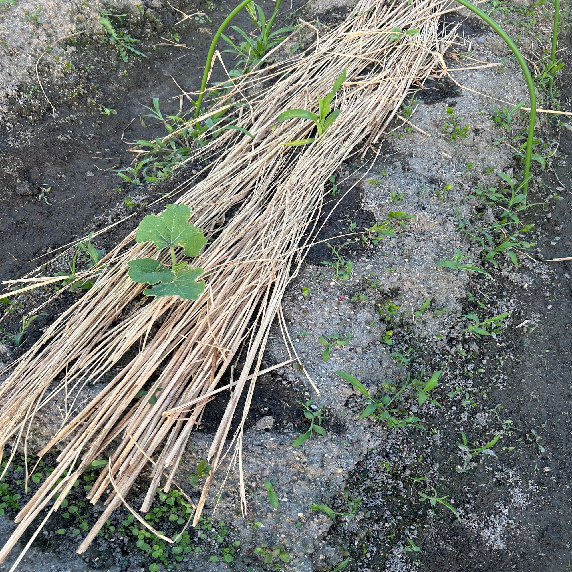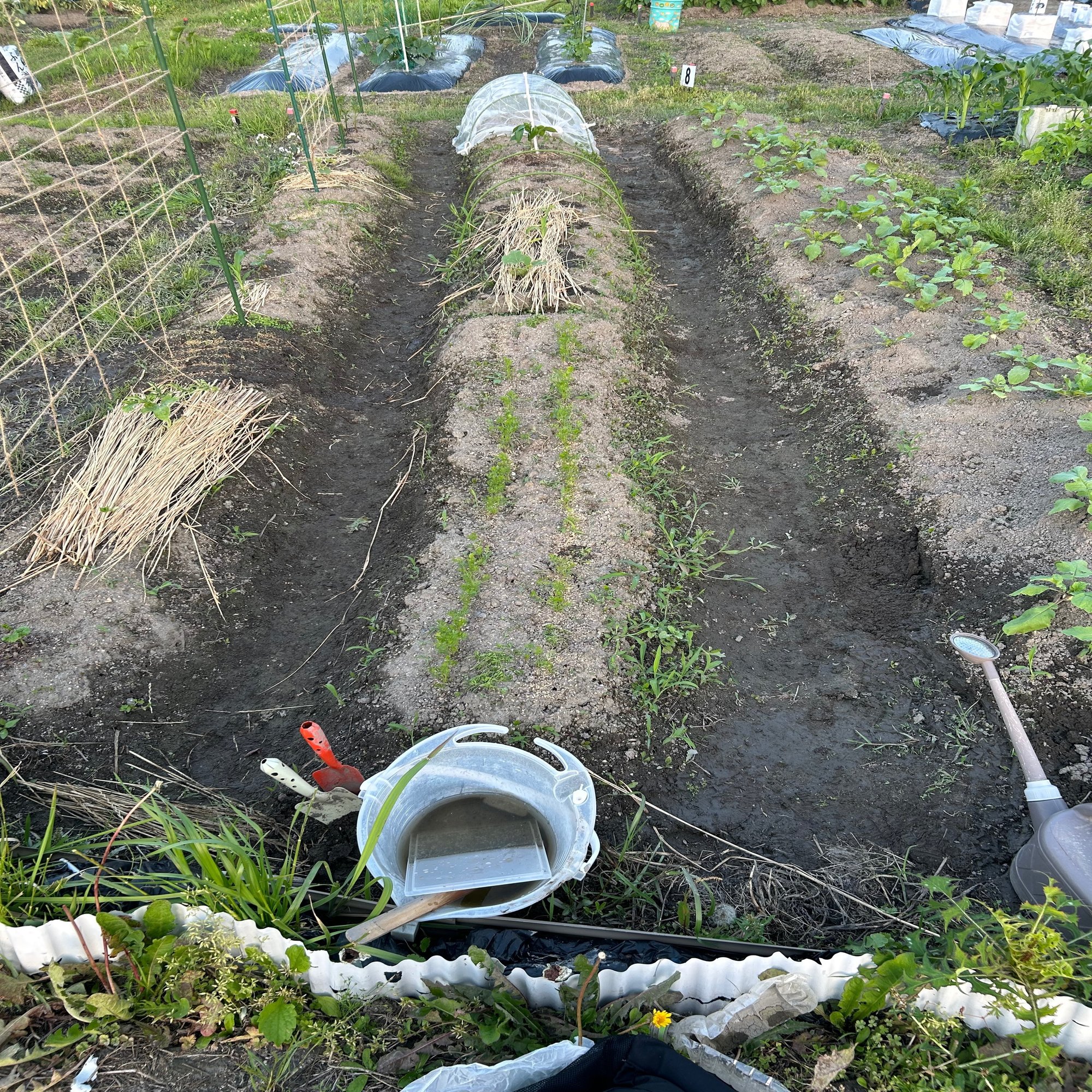 畝で、育苗風に種まきをしたネギがうまく発芽してくれたので、ウリ科やナス科の隣にお引越し😀