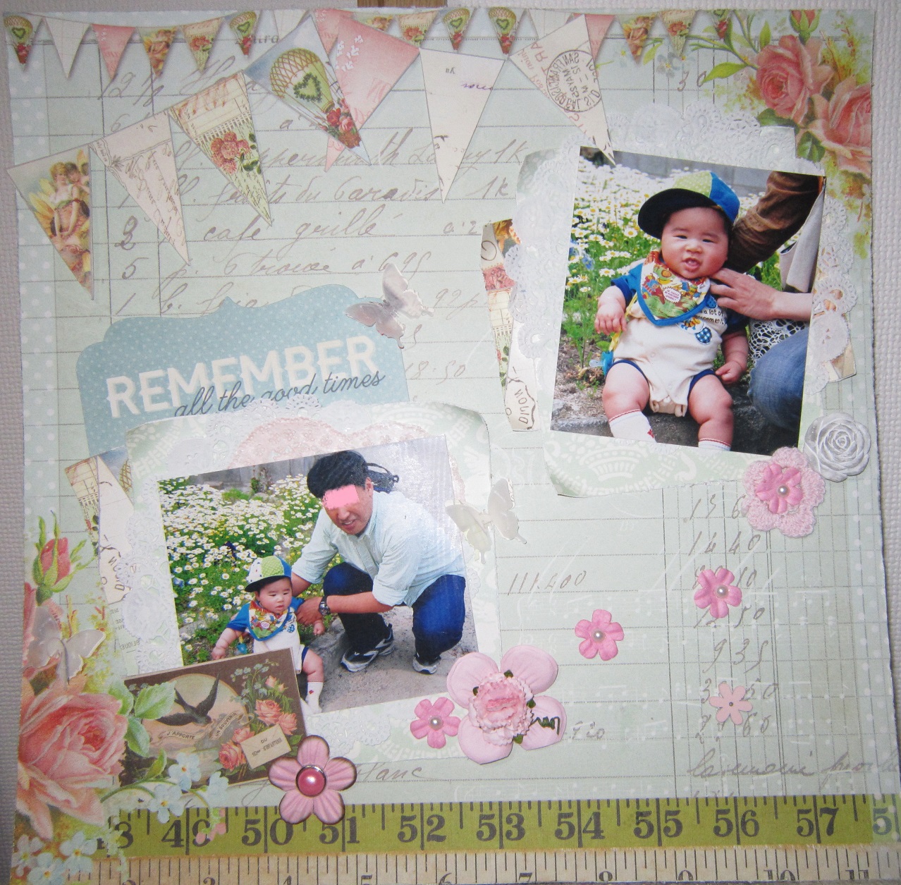 Primaのペーパーでこんにちは^^先日、Primaの新作ペーパーを買いそのままおうちで眠らせていたので今日、ようやくこちらを使ってLOを・・・旦那さん・・久々登場(^^;)息子も随分若い・・・これはおそらく初節句あたりで6ヶ月あたり春のLO・・・・・ですね~♪お花を沢山・・・色々と使ってみました^^レジンフラワーず~っと使いたかったのでやっと登場です蝶も・・・ヴェラムとppを重ね飛ばしてみました(*^_^*)やっぱりPrima・・・華やかになりますね