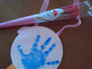 保育園で作ってくれた手形付きの首飾りとカーネーション。
