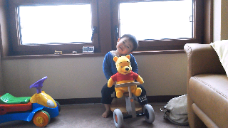くまのプーさんと一緒に三輪車に乗っていてかわいかったのでカメラを向け「ポーズ」って言ったらポーズしてくれた!?