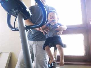 朝、フィットネスマシーンの上で上機嫌な拓海の図。