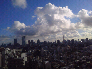 朝、保育園に行く前にベランダ探検。六本木ヒルズも東京タワーも秋晴れの空の中。
