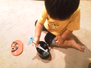 フォークやスプーンを使うのがあまりうまくない拓海。一足飛びでエジソンの箸をたまに与えています。