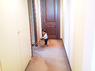 孫の手を杖がわりに廊下を闊歩!