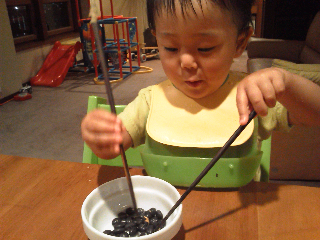 炒り黒豆、喉につまらないように「しっかり噛んで食べて」といったら、ポリポリいい音させて食べました。うんうん首をふりながら「美味しいねー」だって。