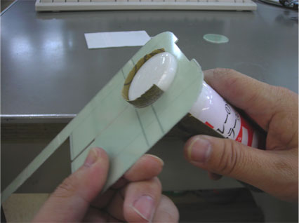 原寸図面にスプレー糊を塗って材料であるFRPにベタッと貼ります。