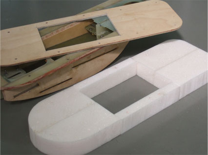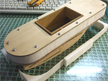 「武骨丸」浮沈材のカット ブロック状に切った発泡アクリルを両面テープ点付で甲板(デッキ)と船体(ハル)の間に挟みこんで・・・ ビスを立てて固定。 ハルとデッキをヤトイに使ってカット! あとの作業の邪魔になるので発泡アクリル材は一旦外しました。