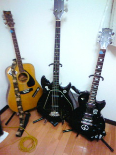 音を生み出す我が家のデモ制作に欠かせない彼ら。右からGibson レスポール・スタジオ。Gibson リッパーベース。YAMAHA アコースティックギター。ま、アコギはあまり家じゃ鳴らさないけど、Gibsonたちは俺の音楽の基盤を作ってくれたかわいいやつら♪とは言え、機材に関しては欲がねぇ(笑)Hima8ri売れたらいいのを買いたい(笑)なんてな(^^ゞ