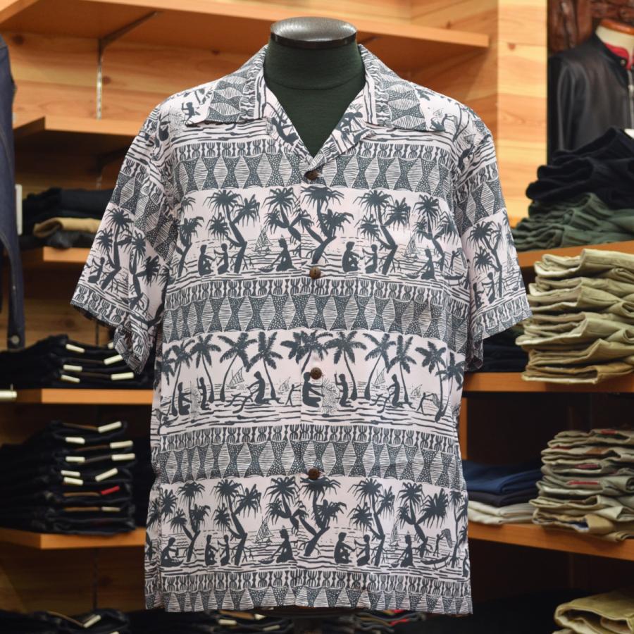 ハワイで古くから親しまれてきた歌のタイトルを音符とともにシャツ全体へと散りばめ、抜染で色鮮やかに表現することでリゾート感あふれるハワイの情景と見事にマッチさせている。
