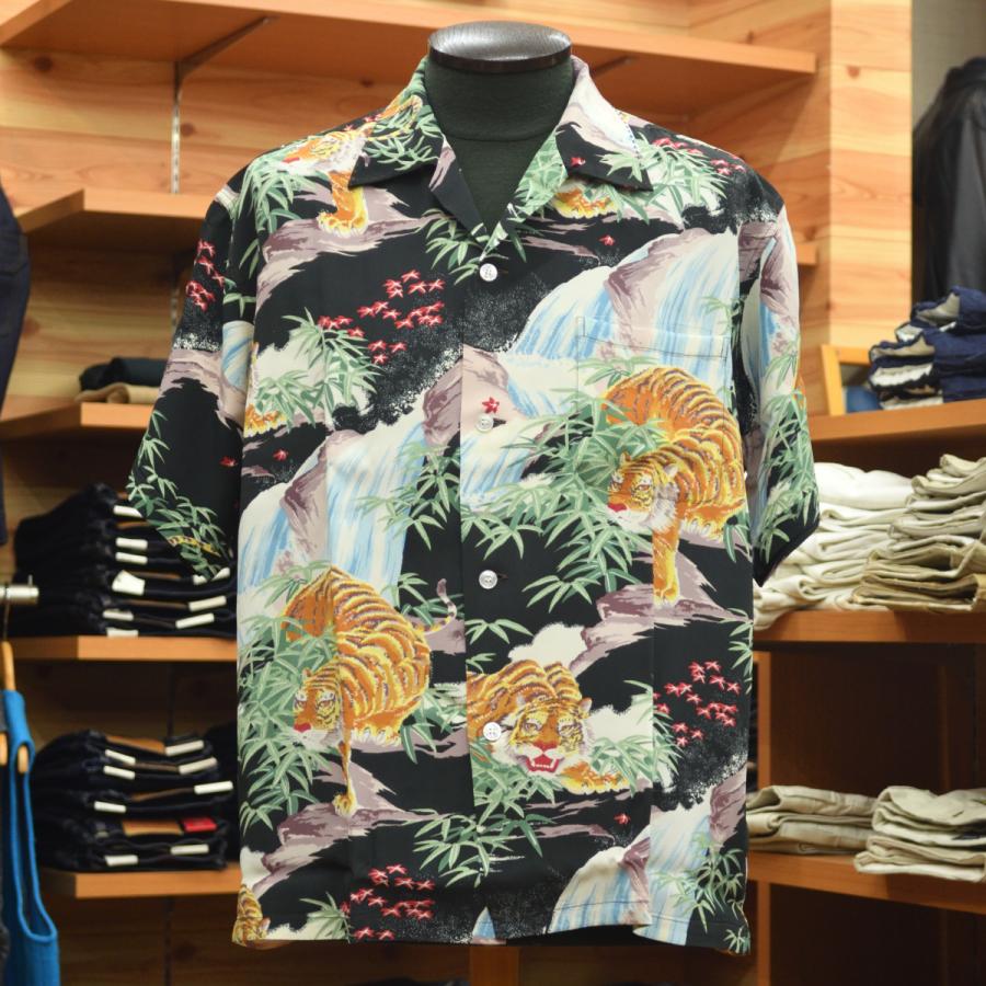 サンサーフのスペシャル・エディションとしては初の復刻となる作品「笹虎」。過去に海外で出版されたヴィンテージ・アロハシャツの専門書にもたびたび登場し、映画『ビッグ・ウェンズデー』の劇中でサム・メルヴィル扮するベアーが着用するなど、知名度も高く人気のデザイン。本作にはレーヨン羽二重を使ったモデルも存在するが、今回はレーヨン壁縮緬素材で製作された極めて貴重なモデルが元となっており、ショートポイントの襟に施されたハンドステッチや袖口の折り返しなど、ヴィンテージの特徴的な縫製仕様も忠実に再現している。