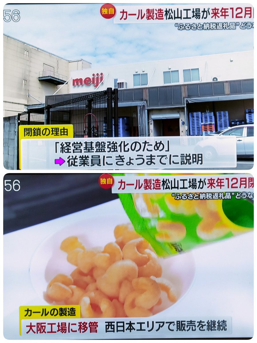 明治カールの愛媛工場が来年12月をもって閉鎖して大阪工場に移管のニュースがあったけえ衝撃的じゃったが😫その反面カールが西日本だけ残るんは唯一の救いなんじゃが🙄これまで生産しとった工場が廃止されるんは残念でならんのう😫
