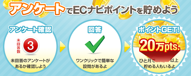 アンケート専門サイトのリサーチパネルは、ECナビと共通のポイントが貯まって人気です。