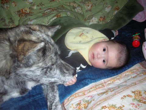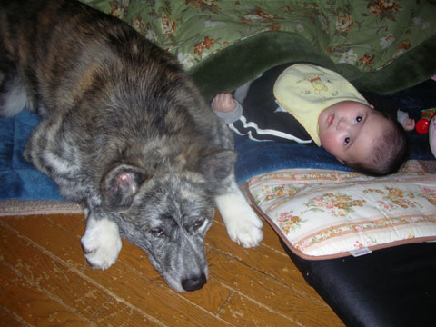 背中に痛みが・・・昨日ぐらいから背中に痛みが走り出しました。疲れでしょうか?昨日は休みの為、夕方の散歩は嫁さんに任せてプールに行き、水中歩行1時間。体の筋を1本1本のばしていき、痛みを取っていくのです。そのあとサウナに入り温めると体が楽になります。昨年と同時期の痛みです。これからは時間があるときは出来るだけプールに行こうと思います。今日の我が家の秋田犬 美人(ミイト)は先日、甥っ子の子供!優衣(ユイ)が我が家に来ていましたのでツーショットの写真です!右下の写真はミイトが優衣の手を舐めているようです。オーノー!