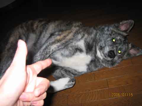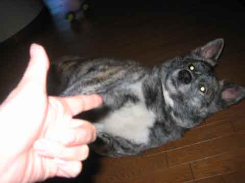 バン!我が家の秋田犬 美人(ミイト)のいくつかある芸のうちで右手をピストルに似せてミイトに向かって「バン!」と言うと死んだふりをします。倒れたままで「よし!」と言うまでその体勢でいます。本人は「何をさすやら」と思っているかも知れませんが今日はその写真です!