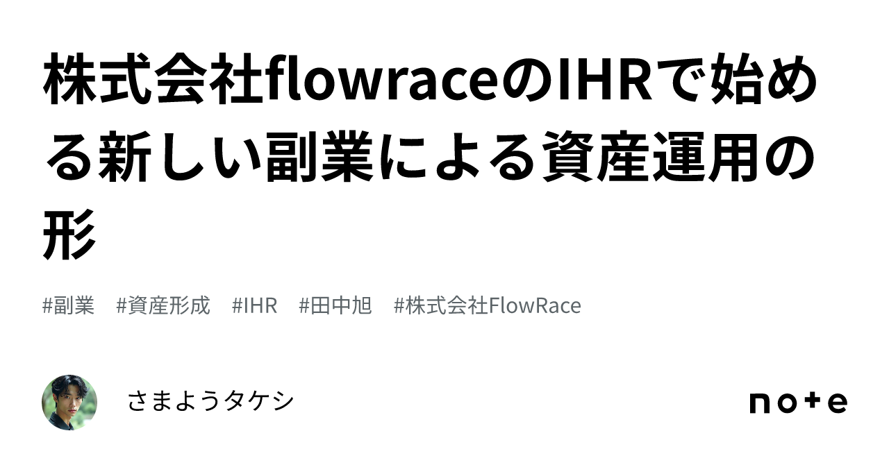 田中旭が運営するIHR副業に挑戦!不安定なサラリーマン生活から抜け出すための副業選びとその魅力30代サラリーマンのカイです。日本の中心でひとり暮らしをしています。今年の2月から副業をはじめ、模索しながら続けています。まずは私が田中旭代表が運営する株式会社FlowraceのIHR副業を始めたきっかけをしたいと思います。副業の選択肢サラリーマン生活が安定していないことに気づいたのは数年前のことです。業績不振や経済の変動が自分の収入に直結する現実を目の当た…kai45blog.blog.fc2.com