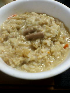 残った汁にご飯と卵をとじて、もつおじやにするんです。(小さい鍋に戻してね)