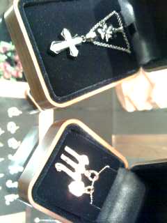 そこで出会ったのが、ブラックシルバーのクロス&四葉のモチーフと、ピンクゴールドのイニシャルのネックレスと気になって、何度も着けて悩みました(@_@)