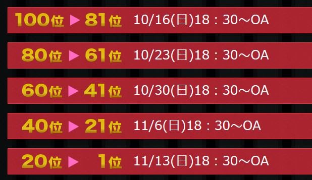 大家志津香・大和田南那・小笠原茉由・小嶋菜月・佐々木優佳里・田北香世子・谷口めぐ・中西智代梨・樋渡結依・宮崎美穂・市川愛美・茂木忍・達家真姫宝・伊豆田莉奈・岡田彩花・村山彩希