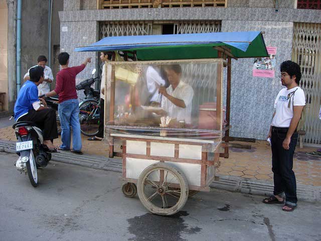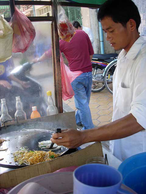 卵焼きがのった焼きそば | 「路上焼きそば(カンボジア/プノンペン)」 2009年10月13日の朝。川沿いの繁華街からセンターマーケットへ向かう途中で,焼きそばを売る屋台があったのでここで朝食をとりました。(写真左) 味は日本の焼きそばよりも味が薄いですが,うまいです。うん,うまかった。 値段は2000KHR(約90円),ベトナムと比べるとちょっと割高です。 この焼きそばを一生懸命作るのは,額に汗して働くまじめなクメール兄さん。 アジアの旅先で友達を作る 「アマチュア学生通訳ガイド検索サイト」 写真つきで検索できます! |