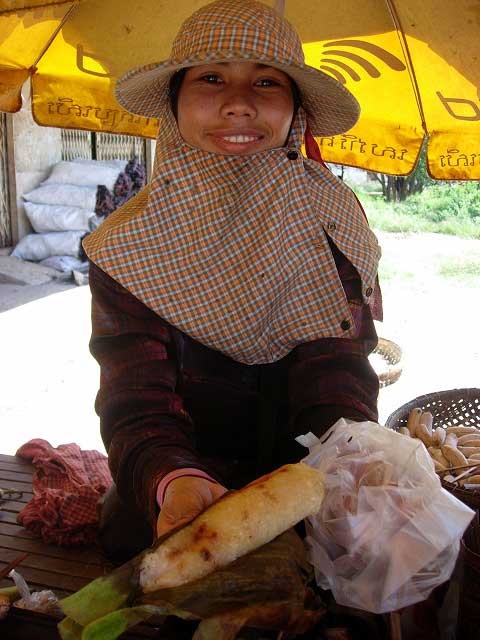いろいろなものを売っています。 | 「プノンペン~シアヌークビル間のドライブイン(カンボジア)」 2009年10月14日,プノンペン~シアヌークビルへバスで向かいました。途中によったドライブインでの写真が左です。 色々あって目移りしますが,おいしそうなものを選んで食べてみました。 まずはパリパリした揚げ物。中身は"はるさめ"みたいなおかずが入ってます。うまい。 お次はご飯で包まれたバナナ。これもうまいですが,量が多くて途中で飽きます。 半分くらいならば,いい思い出で終わったかもしれません。 男女関係と似ています。 値段は両方とも2,000KHR(約46円),安くはない。 アジアの旅先で友達を作る 「アマチュア学生通訳ガイド検索サイト」 写真つきで検索できます! |