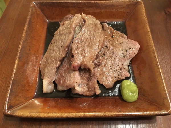 メインはお肉。島原牛。しっかり塩胡椒して、最後にお醤油を焼き絡めました。山葵とあう!このお皿は益子焼。