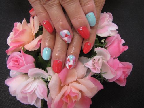 ブロッキングネイル♪ いつもご来店頂いてるO様☆ ジェルのお付け替えです♪ ビビットピンクとパステルグリーンの全塗りに ポイントでブロッキングアート致しました(*^_^*) いつもありがとうございます。 また宜しくお願い致します 横須賀ネイルサロンFancy
