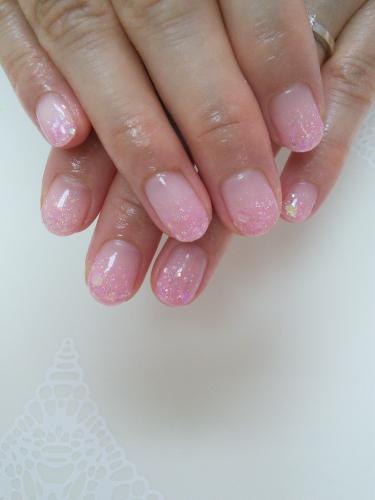 ラメグラデーション♪ 初めてご来店頂いたT様☆ ジェルのお付けかえです♪ ピンクのホロ入りラメグラデーションで シンプルに仕上げました(*^^*) ありがとうございました、また宜しくお願い致します♪ 横須賀ネイルサロンFancy