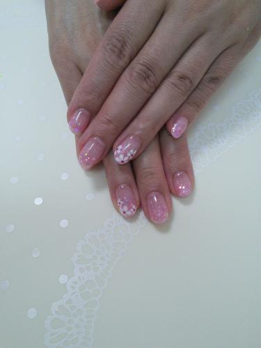 ラメグラデーション♪ いつもご来店頂いてるN様☆ ジェルのお付けかえです♪ ピンクのラメグラデーションに お花のアートをいたしました(*^^*) ありがとうございました、また宜しくお願い致します♪ 横須賀ネイルサロンFancy