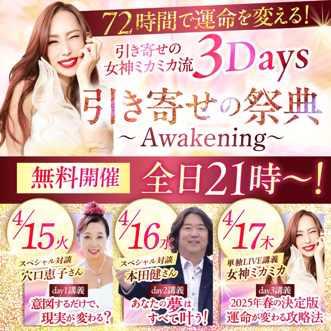 💁♀️こちら只今9ヶ月ぶりの3日間の無料イベント開催中!無料期間だけでも引き寄せの仕組みが分かって現実化出来ると好評!ちょっと気になったら⬇︎のURLから登録して視聴して見てね。