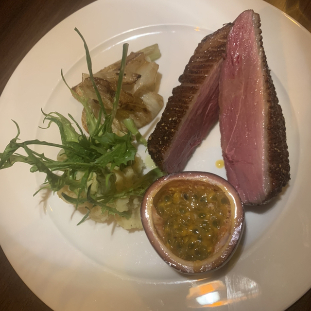 3時間ローストした甘い玉ねぎと花韮と、パッションフルーツのソースと