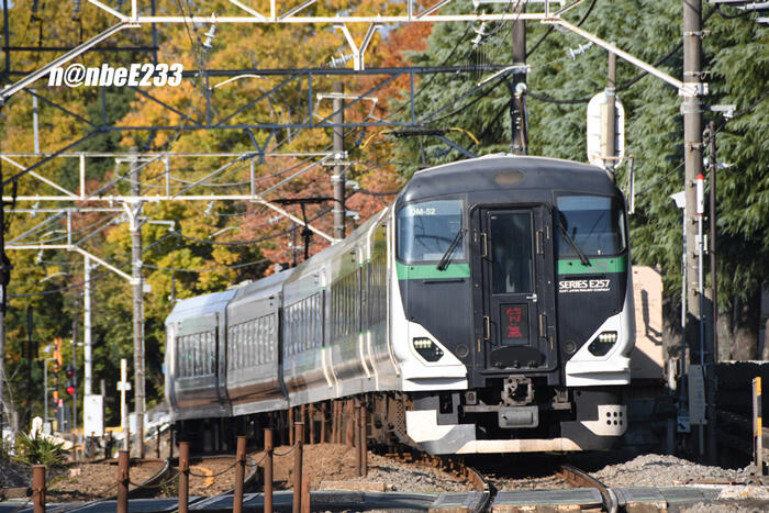 2025.11.16: 特急鎌倉満喫青梅号@南武線今日と来週23日に、青梅からの特急鎌倉満喫青梅号の運転があります。 9270M 特急鎌倉満喫青梅号 E257系/5500 OM-52編成 あと打ち...。 先月の五日市号に続き安定のOM-52編成。 紅葉もだいぶ色づいてきました。 今日はこれ1本だけ。