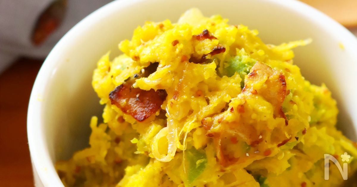 ④ベーコンと玉ねぎを下味をつけたかぼちゃに加えて、混ぜます!