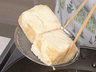 小さめのフライパンに油を1㎝深さに入れて170℃に熱し、(1)の豆腐に片栗粉をまぶして入れる。下面が固まってきたら、返しながら2~3分かけて全面を揚げる。衣がカリッとし、豆腐が熱くなったらとり出し、油をきる。
