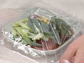 1人分ずつ作る。耐熱の器に(1)のさば1切れを皮目を下にして入れ、(2)の煮汁半量をかけ、青ねぎとしょうが各半量をのせる。ふんわりとラップをして電子レンジ(600W)に3分かけて火を通す。とり出してごま油半量をまわしかける。残りも同様に作る。