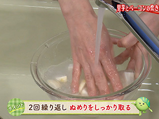 里芋は上下を切り落とし、皮をむいて小さめの一口大に切る。塩を多めにこすりつけて水洗いし、同様にもう1回繰り返してぬめりをとる。ベーコンは1㎝角の棒状に切る。