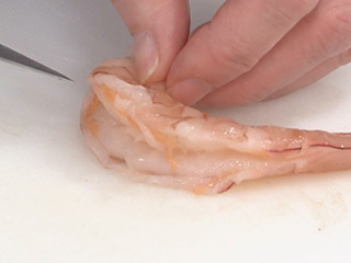 えびは洗って殻をむき、背に切り込みを入れて背ワタを除き、長さを半分に切る。