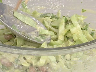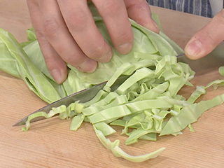 キャベツは3~4㎝長さの細切りにする。セロリの葉は粗く刻む。