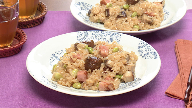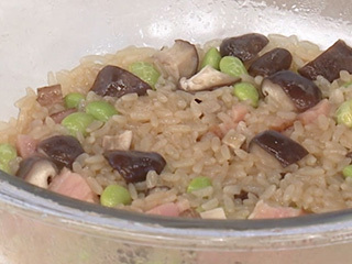 大きい耐熱ボウルに分量の水、しょうゆ、砂糖、オイスターソース、ごま油を入れてひと混ぜし、(1)のもち米を加えて軽く混ぜる。ベーコン、椎茸、むき甘栗、枝豆をのせる。ふんわりとラップをして電子レンジ(600W)に5分かける。