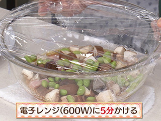 とり出して全体を混ぜ、再びラップをふんわりとして電子レンジに6分かける。とり出してラップをもう1枚ぴったりとかけて10分蒸らす。