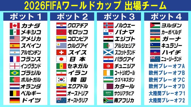 12カ国が4つのポットに分けられている。開催国であるカナダ、メキシコ、アメリカの3カ国はポット1に。残りはFIFAランキングの上位から順にポット1から埋まっていく。 日本は史上初となるポット2に入ることに。出場国が増えたことによる恩恵でもあるが、クロアチアやモロッコ、コロンビアなどとの対戦は回避される。なお、欧州プレーオフの4カ国、大陸間プレーオフの2カ国はポット4に入ることが決定。2026年3月に残りの出場6カ国が決定する。 【ポット1】 27位:カナダ代表 15位:メキシコ代表 14位:アメリカ代表 1位:スペイン代表 2位:アルゼンチン代表 3位:フランス代表 4位:イングランド代表 5位:ブラジル代表 6位:ポルトガル代表 7位:オランダ代表 8位:ベルギー代表 9位:ドイツ代表 【ポット2】 10位:クロアチア代表 11位:モロッコ代表 13位:コロンビア代表 15位:ウルグアイ代表 17位:スイス代表 18位:日本代表 19位:セネガル代表 20位:イラン代表 22位:韓国代表 23位:エクアドル代表 24位:オーストリア代表 26位:オーストラリア代表 【ポット3】 29位:ノルウェー代表 30位:パナマ代表 34位:エジプト代表 35位:アルジェリア代表 36位:スコットランド代表 39位:パラグアイ代表 40位:チュニジア代表 42位:コートジボワール代表 50位:ウズベキスタン代表 51位:カタール代表 60位:サウジアラビア代表 61位:南アフリカ代表 【ポット4】 66位:ヨルダン代表 68位:カーボベルデ代表 72位:ガーナ代表 82位:キュラソー代表 84位:ハイチ代表 86位:ニュージーランド代表 欧州PO①:イタリア代表、北アイルランド代表、ウェールズ代表、ボスニア・ヘルツェゴビナ代表 欧州PO②:ウクライナ代表、スウェーデン代表、ポーランド代表、アルバニア代表 欧州PO③:トルコ代表、ルーマニア代表、スロバキア代表、コソボ代表 欧州PO④:デンマーク代表、北マケドニア代表、チェコ代表、アイルランド代表 大陸間PO①:ニューカレドニア代表、ジャマイカ代表、コンゴ民主共和国代表 大陸間PO②:ボリビア代表、スリナム代表、イラク代表