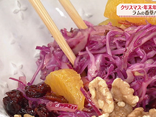 オレンジは薄皮まで皮を除く。房に沿ってナイフを入れて果肉を切り出し、残った薄皮の汁を絞り、(2)にくるみとともに加えてあえる。