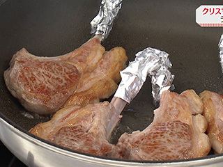 ラムチョップの側面の脂身2~3か所に切り込みを入れる。骨についている脂の多い部分に、骨に沿って切り込みを入れる。骨にオリーブ油適量をハケでぬり、骨の先端を覆うようにアルミ箔を巻く。
