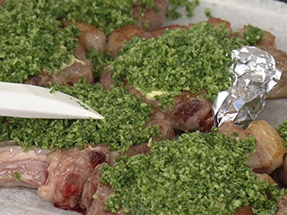 (7)をオーブンから出し、上面に(8)を等分にぬり、(3)の香草パン粉適量をのせ、軽く押さえる。