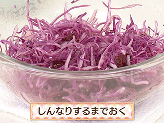 紫キャベツはせん切りにし、紫玉ねぎは横薄切りにする。