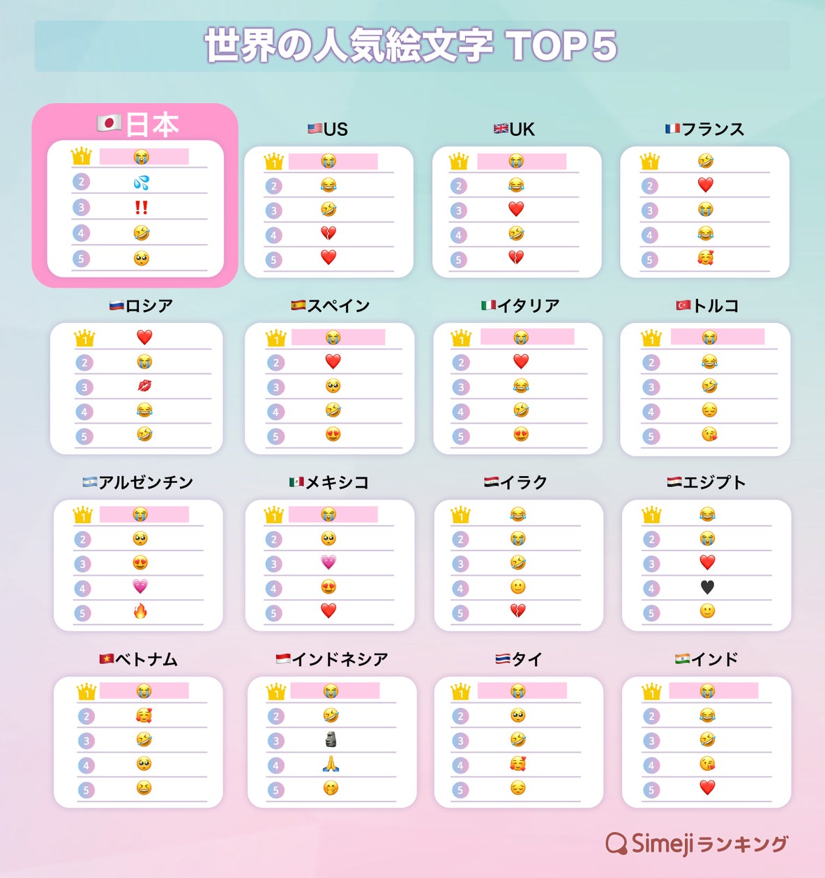 余談ですが、ネットニュースによるといちばん使われた絵文字は 😭 らしいです。