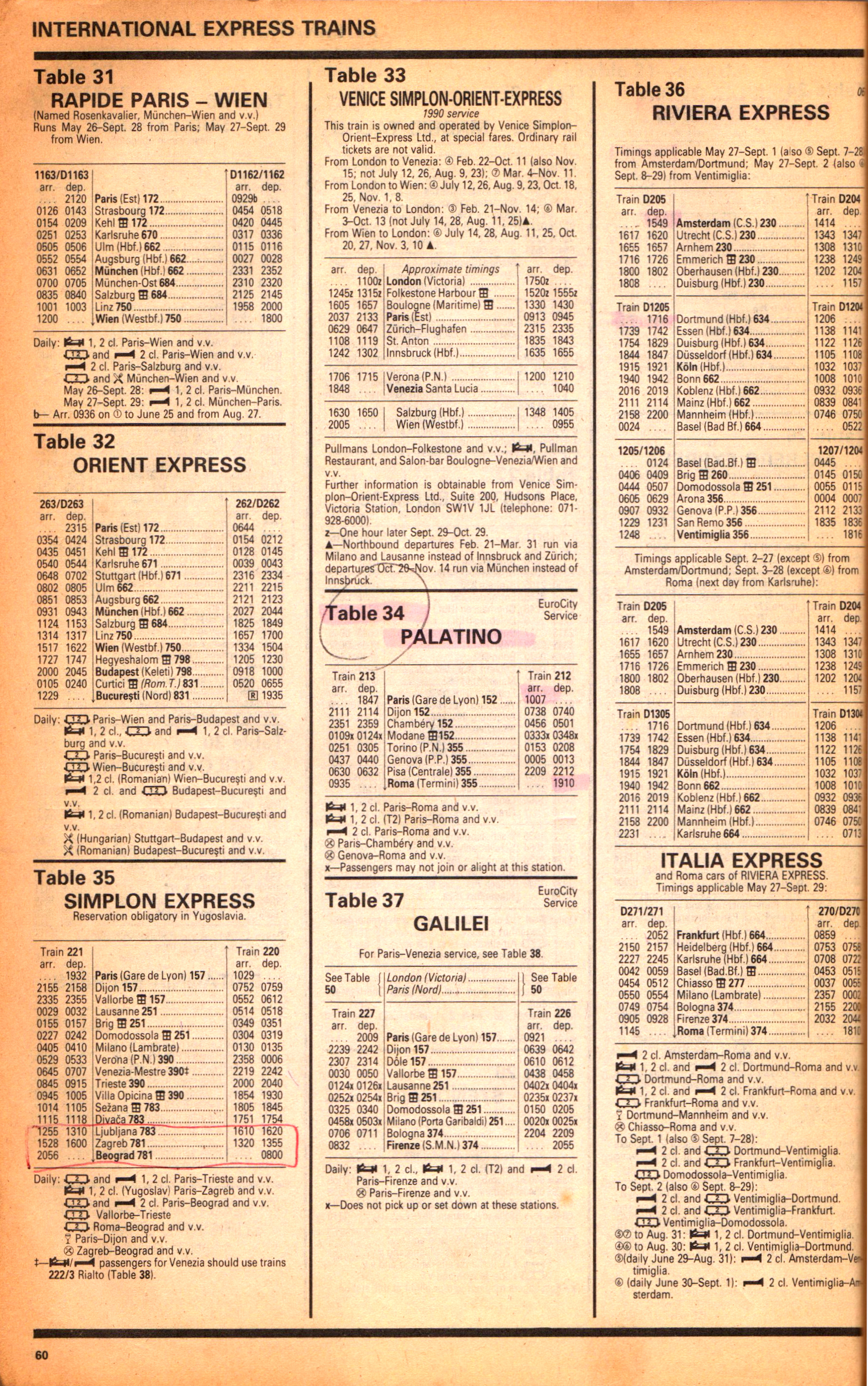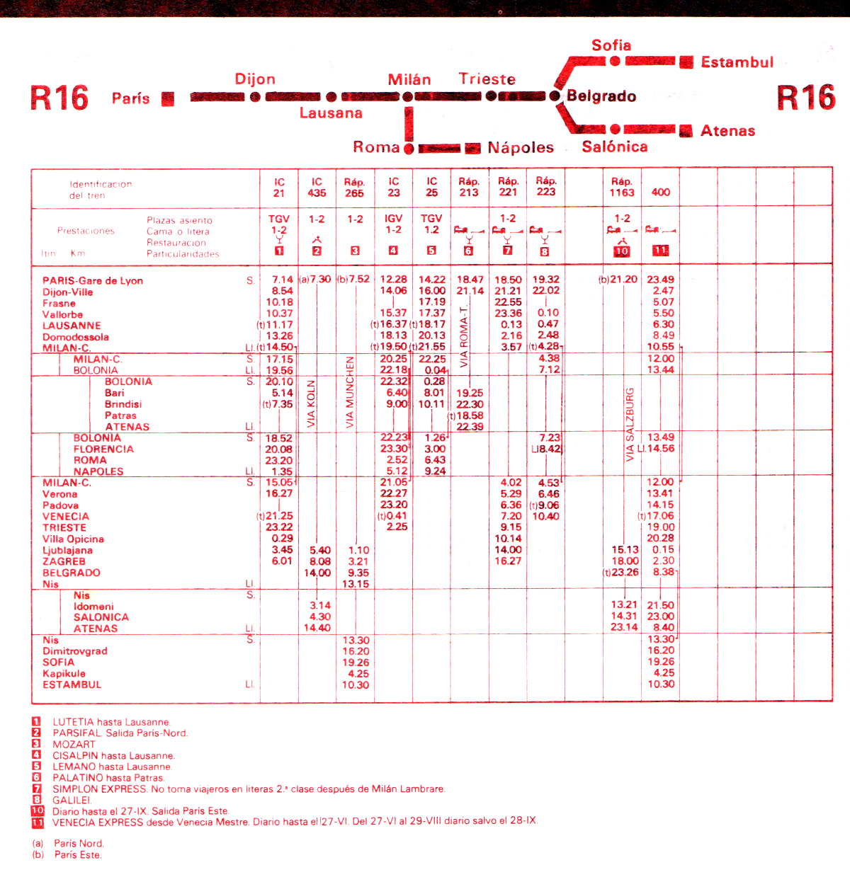 1985年スペイン国鉄時刻表↓ ORIENT EXP.の名が消えた 右端列車No11 表の下注参照
