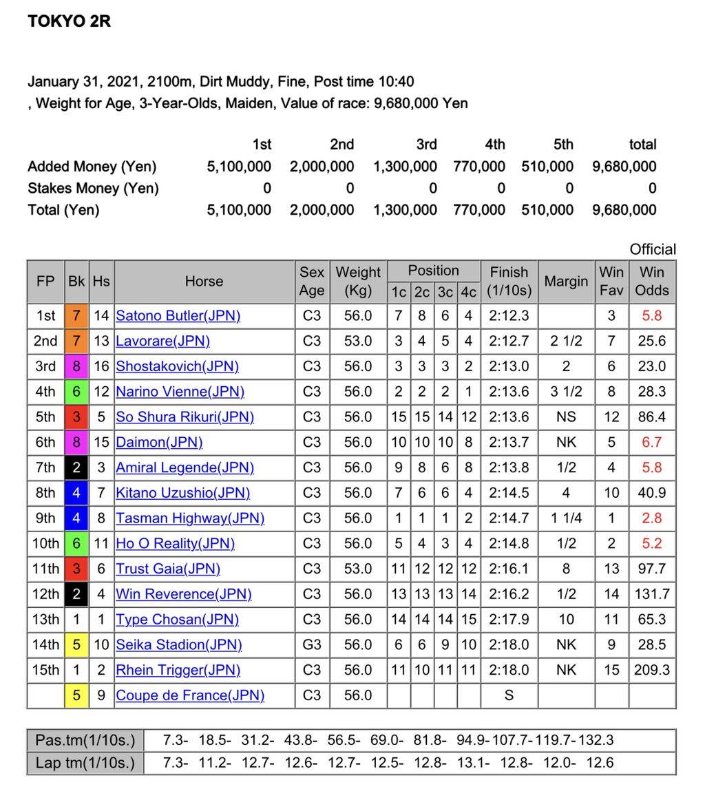 1/31/2021 Tokyo Race 2 Maiden 2100m (Dirt)